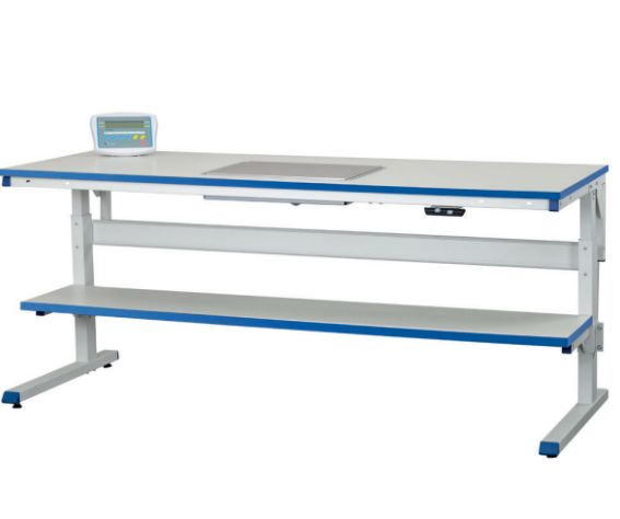 2-Fuß-Tischgestell mit motorischer Höhenverstellung mit Arbeitsplatte aus grau Hochdrucklaminat, Unterplatte und eingebauter Waage 0 - 60 kg, Messbereich 20 g.